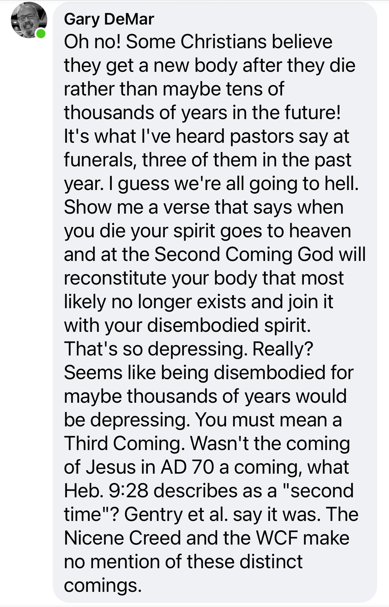 Gary has begged for patience while he works through these eschatological issues. For awhile, I referred to his views as “agnostic” and “ambiguous.” It is clear to me now that his views are no longer agnostic or ambiguous at all. He simply denies the orthodox Faith. Indeed, he mocks it, as he does here from a public statement over the last few days: